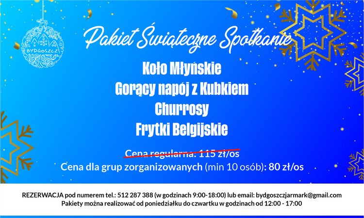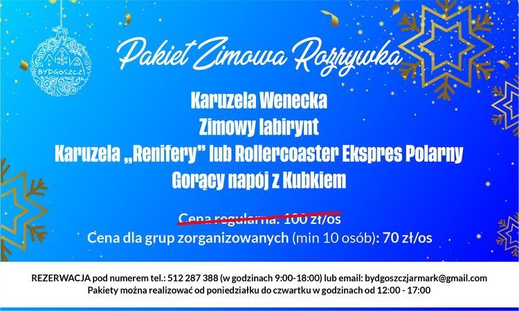 Dla grup zorganizowanych przygotowano specjalne pakiety, które pozwolą w pełni cieszyć się atmosferą Bydgoskiego Jarmarku Świątecznego i skorzystać z wyjątkowych atrakcji. Szczegółowe informacje dostępne TUTAJ. Organizatorem wydarzenia jest Miasto Bydgoszcz.